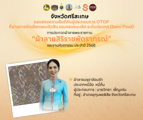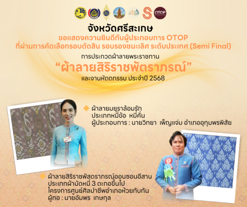 จังหวัดศรีสะเกษ ขอแสดงความยินดีผู้ผลิตผู้ประกอบการ OTOP ทั้ง 2 ผลงานทะลุเข้ารอบ Semi Final