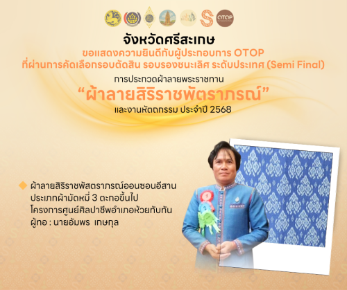 ซึ่งจังหวัดศรีสะเกษมีผ้าที่ผ่านการคัดเลือกรอบรองชนะเลิศ ระดับประเทศ (Semi Final) จำนวน 2 ผืน