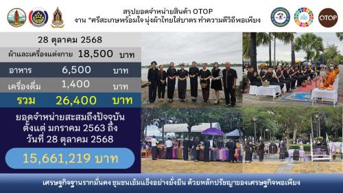 โดยมียอดจำหน่ายสินค้า OTOP ในวันที่ 28 ตุลาคม 2568 จำนวน 26,400 บาท ยอดจำหน่ายสะสมตั้งแต่มกราคม 2563 จนถึงปัจจุบัน จำนวน 15,661,219 บาท