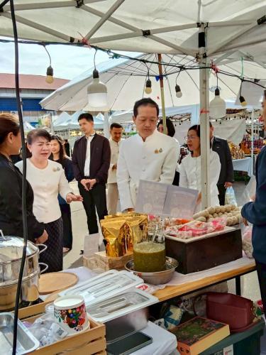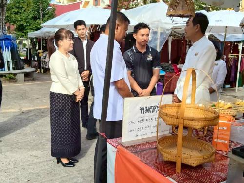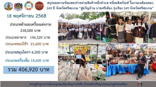 นายอนุรัตน์ ธรรมประจำจิต ผู้ว่าราชการจังหวัดศรีสะเกษ พร้อมด้วย นางโสภา ธรรมประจำจิต นายกเหล่ากาชาดจังหวัดศรีสะเกษ เยี่ยมชมและให้กำลังใจผู้ผลิต ผู้ประกอบการ OTOP และเครือข่ายโคก หนอง นา พช. ที่นำสินค้า OTOP และสินค้าวัฒนธรรมมาร่วมจัดแสดงและจำหน่ายในงาน “สู่ขวัญบ้าน บายศรีเมือง รุ่งเรือง 243 ปี จังหวัดศรีสะเกษ” ประจำปี 2568 ซึ่งจัดขึ้นระหว่างวันที่ 18–19 พฤศจิกายน 2568 ณ บริเวณหน้าที่ว่าการอำเภอเมืองจังหวัดศรีสะเกษ