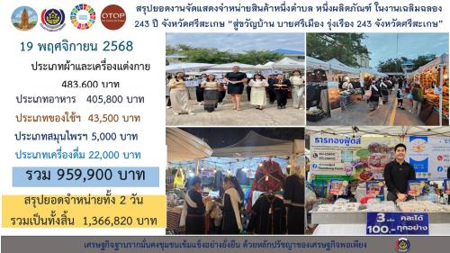 “ปังไม่หยุด!” พช.ศรีสะเกษ จัดแสดง–จำหน่ายสินค้า OTOP และสินค้าวัฒนธรรม ชูผ้าทอเบญจศรี ในงานเฉลิมฉลอง 243 ปี จังหวัดศรีสะเกษ ฟื้นฟูเศรษฐกิจฐานราก สร้างรายได้สู่ชุมชน