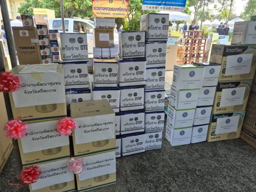 ในการนี้ นางทรัพย์สิน โพธิ์ขาว พัฒนาการจังหวัดศรีสะเกษ พร้อมด้วย นางสาวธนพร ขจิตเวทย์ ผู้อำนวยการกลุ่มงานสารสนเทศการพัฒนาชุมชน นางสาวนฤมล พื้นแสน ผู้อำนวยการกลุ่มงานส่งเสริม การพัฒนาชุมชน นายอมร ธุษาวัน ผู้อำนวยการกลุ่มงานประสานและสนับสนุนฯ พัฒนาการอำเภอ นักวิชาการพัฒนาชุมชนจังหวัด เข้าร่วมงานวันรวมน้ำใจสู่ชาวศรีสะเกษ เพื่อเป็นธารน้ำใจลุ้นจับสลากรางวัล ในงานเทศกาลปีใหม่สี่เผ่าไทศรีสะเกษ ประจำปี พ.ศ. 2569 พร้อมร่วมบริจาคสนับสนุนรางวัลธารากาชาด ร่วมกับเครือข่าย OTOP และเครือข่ายกองทุนหมู่บ้านและชุมชนเมือง ได้แก่ ตู้เย็น 5 คิว จำนวน 1 หลัง หม้อหุงข้าว ขนาด 1.8 ลิตรจำนวน 17 ใบ กระทะไฟฟ้า 6 ใบ การต้มน้ำไฟฟ้า 16 ใบ พัดลมตั้งโต๊ะ ขนาด 12 นิ้ว จำนวน 4 เครื่อง