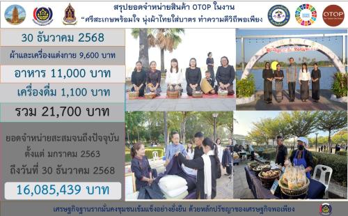 โดยมียอดจำหน่ายสินค้า OTOP ในวันที่ 30 ธันวาคม 2568 จำนวน 21,700 บาท ยอดจำหน่ายสะสมตั้งแต่มกราคม 2563 จนถึงปัจจุบัน จำนวน 16,085,439 บาท