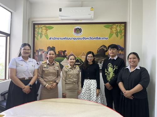 โดยมีนางทรัพย์สิน โพธิ์ขาว พัฒนาการจังหวัดศรีสะเกษ พร้อมด้วยนางสาวธนพร ขจิตเวทย์ ผู้อำนวยการกลุ่มงานสารสนเทศการพัฒนาชุมชน นางสาวนฤมล พื้นแสน ผู้อำนวยการกลุ่มงานส่งเสริมการพัฒนาชุมชน และนักศึกษาฝึกประสบการณ์วิชาชีพ วิทยาลัยกฎหมายและการปกครอง มหาวิทยาลัยราชภัฏศรีสะเกษ จำนวน 3 ราย ร่วมให้การต้อนรับผู้ช่วยศาสตราจารย์ปรารถนา มะลิไทย อาจารย์นิเทศจากวิทยาลัยกฎหมายและการปกครอง มหาวิทยาลัยราชภัฏศรีสะเกษ