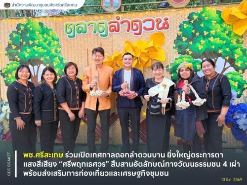 13 มีนาคม 2569 เวลา 19:30 น. ณ สวนสมเด็จพระศรีนครินทร์ศรีสะเกษ นางสาวซาบีดา ไทยเศรษฐ์ รัฐมนตรีว่าการกระทรวงวัฒนธรรม เป็นประธานในพิธีเปิดงานเทศกาลดอกลำดวนบาน สืบสานประเพณีสี่เผ่าไทย ประจำปี 2569 โดยมี นายอนุรัตน์ ธรรมประจำจิต ผู้ว่าราชการจังหวัดศรีสะเกษ นางโสภา ธรรมประจำจิต นายกเหล่ากาชาดจังหวัดศรีสะเกษ หัวหน้าส่วนราชการ ผู้บริหารองค์กรปกครองส่วนท้องถิ่น ข้าราชการ และประชาชนเข้าร่วมงานอย่างคึกคัก ร่วมให้การต้อนรับ พร้อมนี้ นายวิชิต ไตรสรณกุล นายกองค์การบริหารส่วนจังหวัดศรีสะเกษ ในฐานะประธานคณะกรรมการจัดงาน กล่าวถึงที่มาของการจัดงาน ระหว่างวันที่ 11–15 มีนาคม 2569 เพื่ออนุรักษ์และส่งเสริมศิลปวัฒนธรรม ภูมิปัญญาท้องถิ่น และวิถีชีวิตของชน 4 เผ่า ได้แก่ ลาว เขมร ส่วย และเยอ พร้อมทั้งประชาสัมพันธ์การท่องเที่ยวของจังหวัดศรีสะเกษให้เป็นที่รู้จักอย่างกว้างขวาง พร้อมเปิดตัวไฮไลต์การแสดงประกอบแสงสีเสียงชุด “อารยธรรมแห่งศรัทธา มนตรา ศรีพฤทเธศวร” ตอน กำเนิดเทวราชา สถาปนาศรีพฤทเธศวร ที่ถ่ายทอดตำนานการสร้างเมืองผ่านเทคนิคสมัยใหม่ สร้างความตระการตาและประทับใจให้แก่ผู้ร่วมงานอย่างยิ่งใหญ่ท่ามกลางดอกลำดวนที่บานสะพรั่งส่งกลิ่นหอมทั่วบริเวณสวนสมเด็จฯ