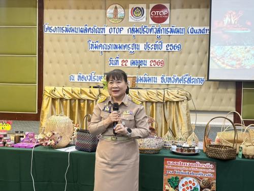 นางทรัพย์สิน โพธิ์ขาว พัฒนาการจังหวัดศรีสะเกษ มอบนโยบายแก่ผู้ผลิตผู้ประกอบการ OTOP กลุ่มปรับตัวสู่การพัฒนา (Quadrant D) ในการประชุมเชิงปฏิบัติการตามโครงการพัฒนาผลิตภัณฑ์ OTOP กลุ่มปรับตัวสู่การพัฒนา (Quadrant D) ให้มีคุณภาพมาตรฐาน ประจำปีงบประมาณ พ.ศ. 2569 ครั้งที่ 2 พร้อมเยี่ยมชมผลิตภัณฑ์ใหม่ที่พัฒนาแล้ว โดยมี นางสาวนฤมล พื้นแสน ผู้อำนวยการกลุ่มงานส่งเสริมการพัฒนาชุมชน นางสาวนิตยา คำโสภา ผู้ช่วยผู้อำนวยการกลุ่มงานฯ นักวิชาการกลุ่มงานส่งเสริมการพัฒนาชุมชน กลุ่มผู้ผลิตผู้ประกอบการ OTOP กลุ่มปรับตัวสู่การพัฒนา (Quadrant D) 25 กลุ่ม 25 ผลิตภัณฑ์ เข้าร่วมกิจกรรมและนำเสนอผลิตภัณฑ์ใหม่ที่พัฒนาแล้ว สรุปผลการพัฒนาผลิตภัณฑ์ และบรรจุภัณฑ์ นอกจากนี้ ยังมีการสอนเทคนิคการถ่ายภาพผลิตภัณฑ์ เทคนิคการตลาดออนไลน์ และผู้ประกอบการ OTOP ร่วมตรวจสอบข้อมูลบรรจุภัณฑ์